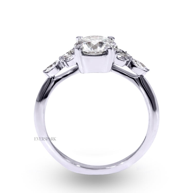 The Elena engagement ring is a perfect fit for a beautiful bride. Crafted with hand-cut Everspark Moissanite, the Elena design is fit for a forest princess. The Elena engagement ring features its stunning round centre stone and six marquise side stones.