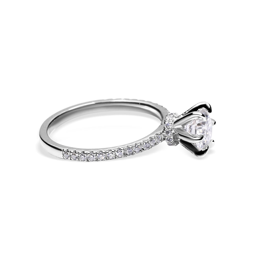 The Tamia engagement ring features a classic design enhanced by brilliant pave sidestones along the band. A delicate hidden halo beneath the magnificent centre stone adds an exquisite layer of sparkle and detail, creating a captivating profile from every angle.